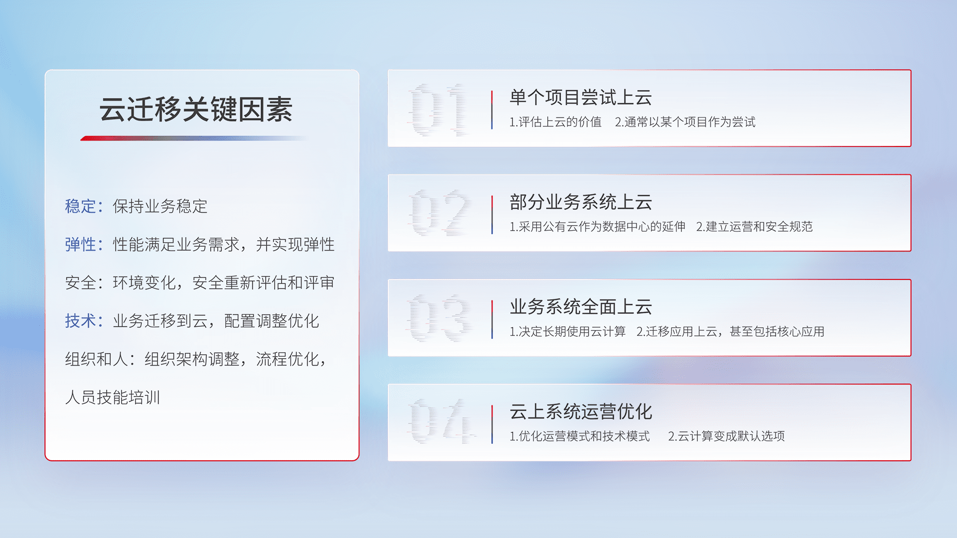 结合实际业务,,,,从规划设计、、、、云平台选型、、云原生改造、、数据迁移、、、集成交付,,迁移全过程为客户识别最佳上云路径,,,做好风险识别管理,,设计网络架构、、身份权限、、、、安全审计合规、、操作审计、、日志审计、、监控告警策略、、、、多站点容灾设计等,,,对云上基础设施进行整体规划,,,,提升IT治理水平,,,以满足弹性、、、高可用、、、、高性能的需求。。。