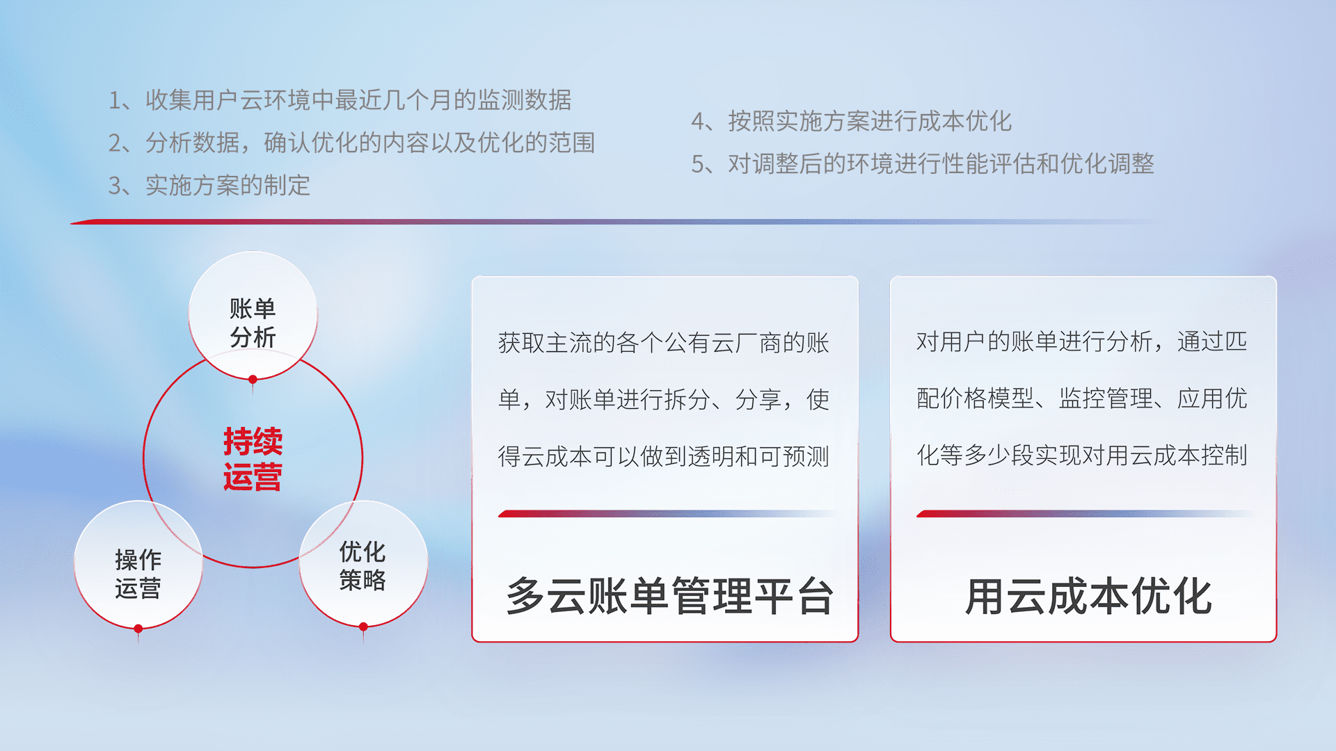 通过多云纳管,,,以统一的资源数据模型把客户的云资源进行抽象和封装,,,,进而实现对多云资源的统一操作,,保障云资源管理的可靠性、、、、稳定性与可用性。。量身定制化运维内容,,,配置、、开发运维、、、、补丁管理、、、备份、、、、监控、、、、认证和访问管理、、审计和日常巡检等,,,保障在用云过程中的可靠度,,,稳定度以及高可用率。。。。
